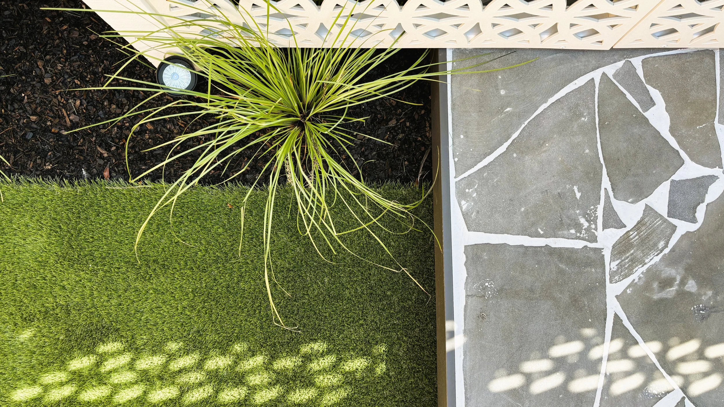 A small unit with a dated outdoor yard revitalised into a modern peaceful space. The decorative screening brings life into the area infusing it with contemporary elegance while offering visual interest. The introduction of the crazy paving brings a welcoming seating area while with the artificial turf provides the greenery needed to bring it all together.